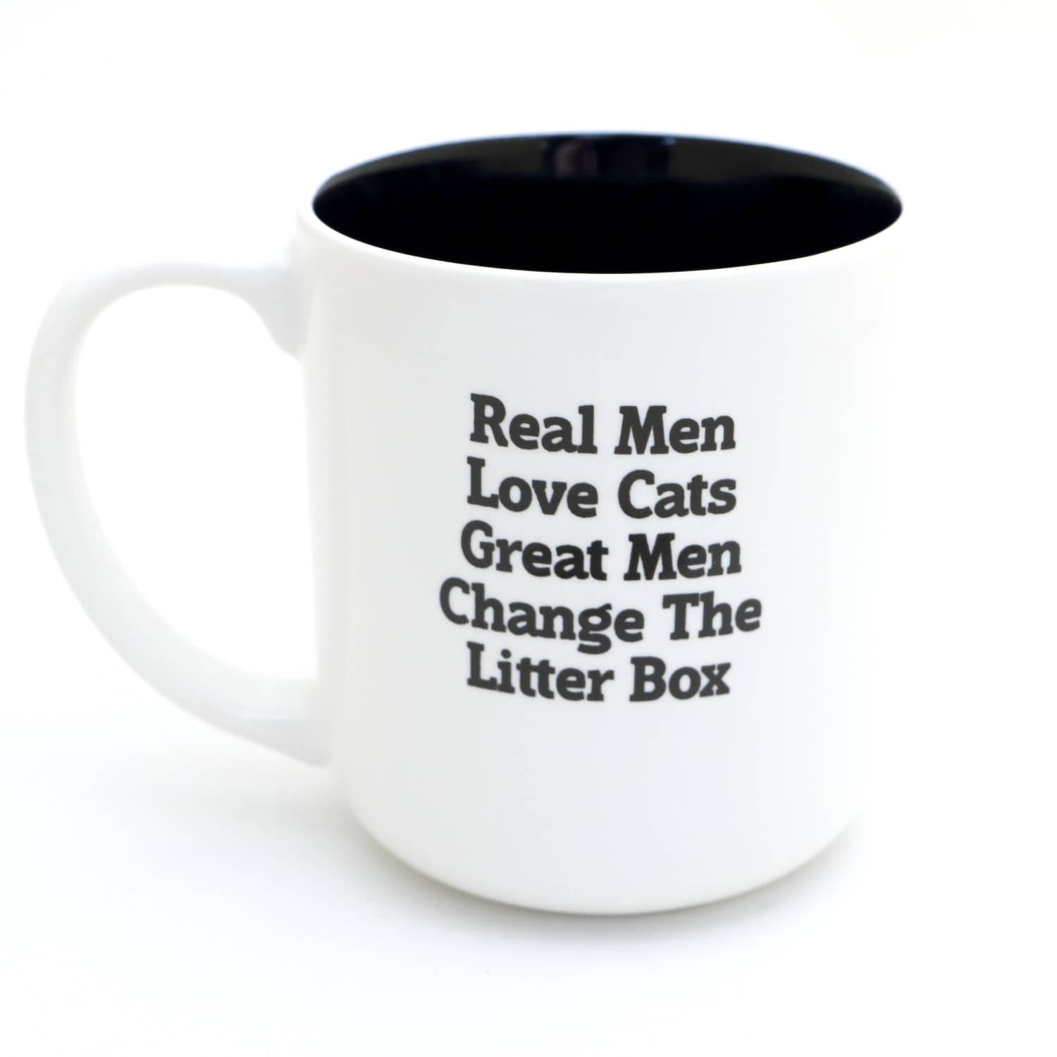 Just a Guy Who Loves Cats mug, funny cat mug, gift for him. Back reads: Real men Love Cats Great Men Change the Litter Box. Inside is glossy black. My tribute to dudes everywhere who help out with the four footed babies. Some men are born to cats- others have cats thrust upon them. Either way, this mug will make them smile. Handmade Stoneware mug fired to over 2000 degrees and created using all non toxic. lead free materials. The mug measures 4 x 4 and holds 16 oz. Safe to place in the dishwasher and microwave. Made to be used and enjoyed!