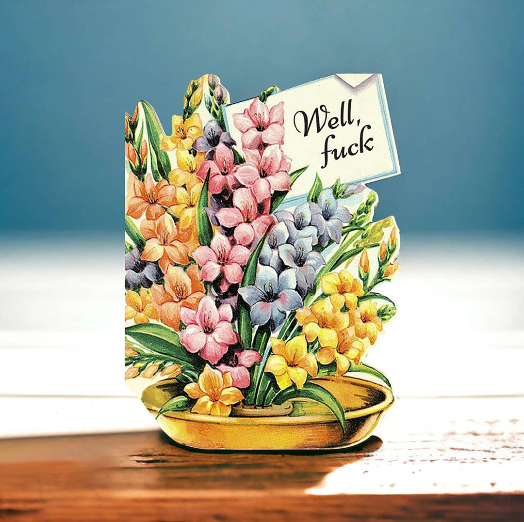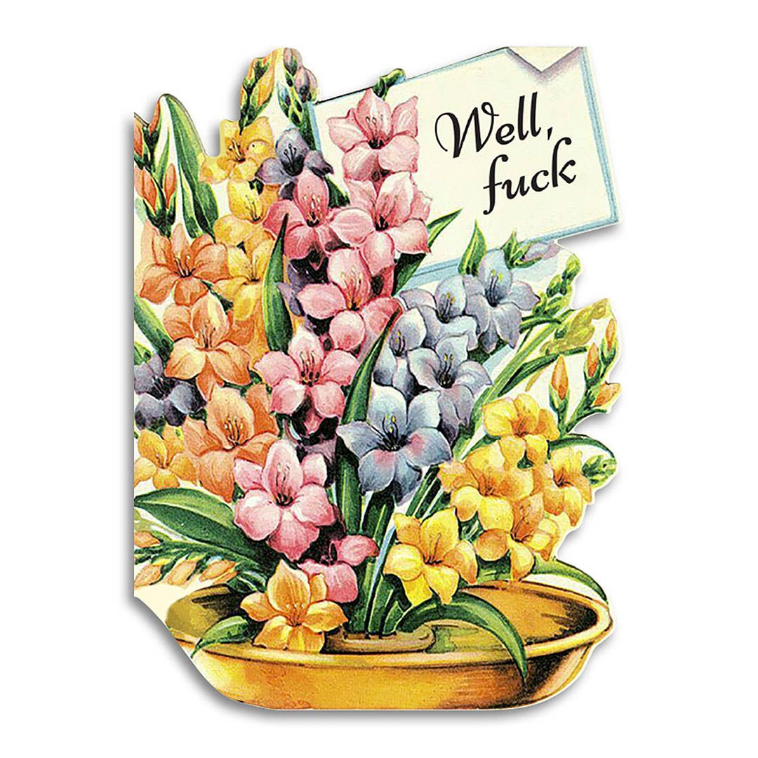 A vintage-style sympathy card featuring a bouquet with a tag that bluntly says, "Well, fuck." Perfect for sending heartfelt condolences with a touch of raw honesty. Say it like it is with this uniquely candid and empathetic card.