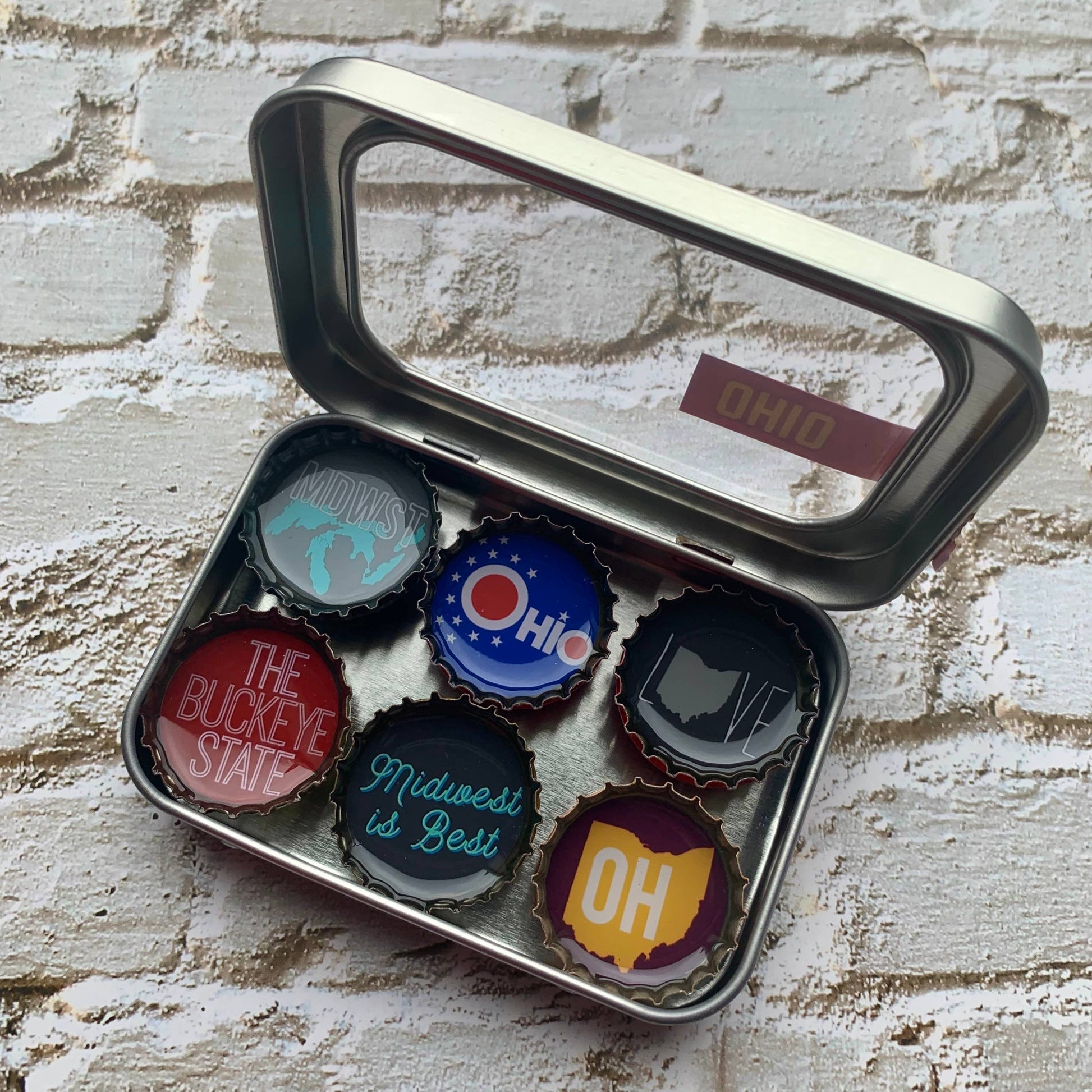 Handmade, woman owned, eco-friendly magnets made from upcycled bottlecaps. We pour eco-conscious epoxy over the image creating a glassy finish. Six-pack set of Ohio themed magnets, made in the USA from recycled bottle caps. Our magnetic expressions make fabulous and unique gifts and can be used in the kitchen, office or on any magnetic surface. Each magnet set comes in the display tin (just like in the picture) and the magnets are strong enough to hold the entire tin on a magnetic surface for display.