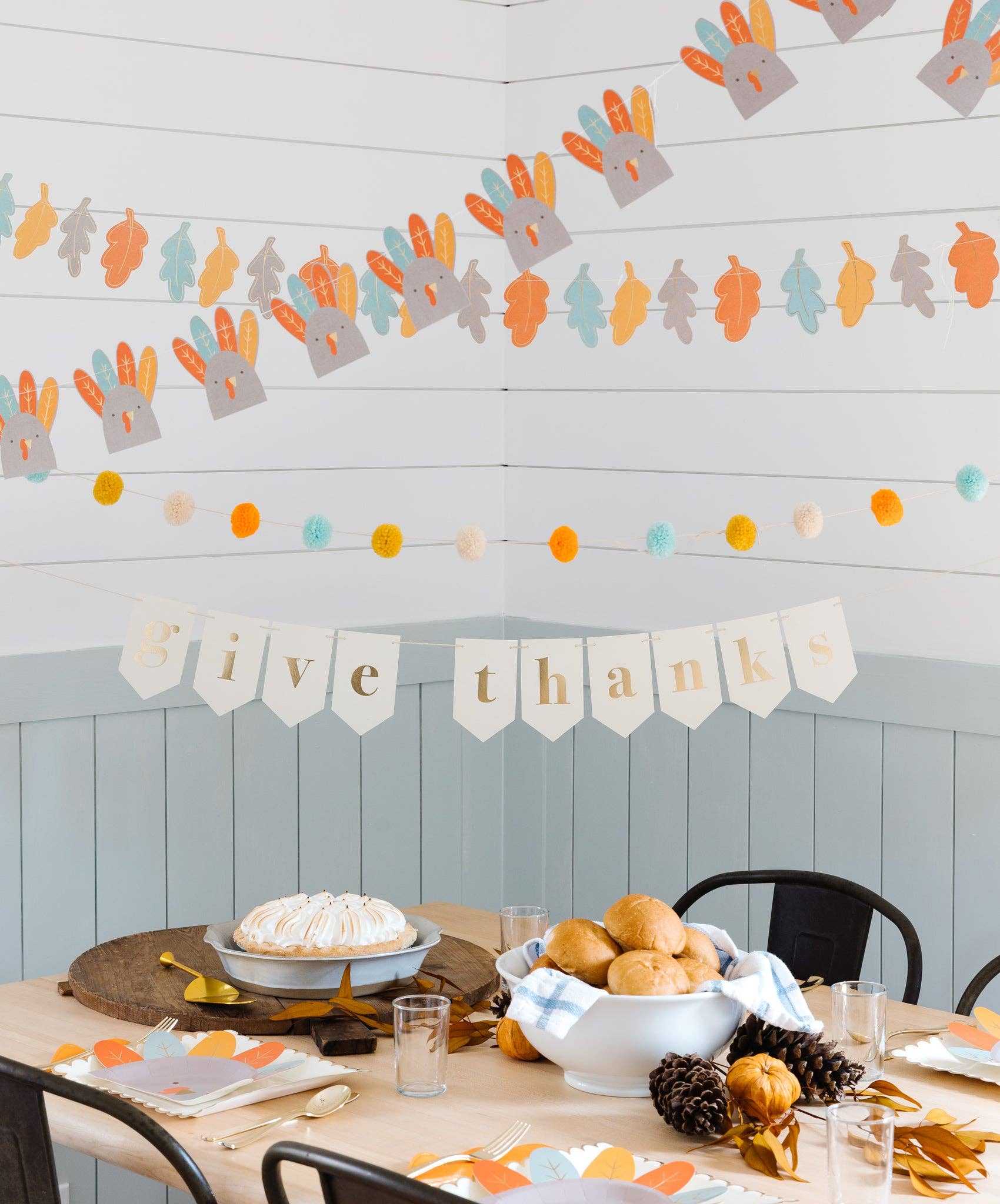 Crisp fall weather is in the air and it is time to give thanks. This banner set is the perfect way to set the mood this autumn! There are cream pennant word banners with gold foil accents and the phrase "give thanks." The leaf banner features bright fall colors and gold foil accents which are sure to tie together a cozy autumn mantle decor set!