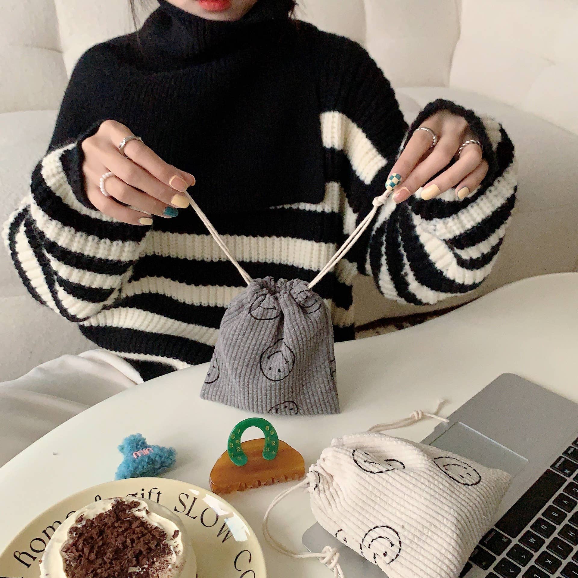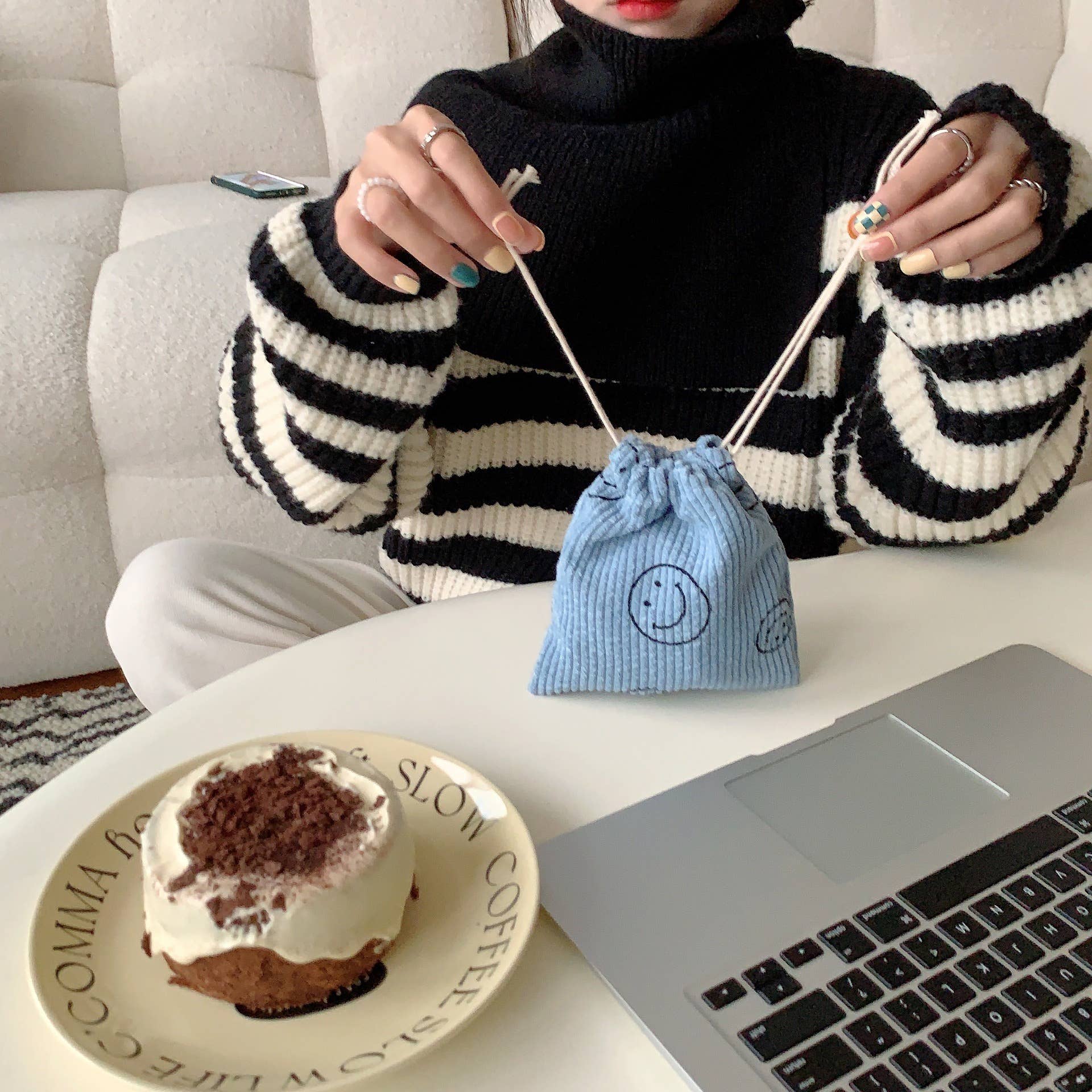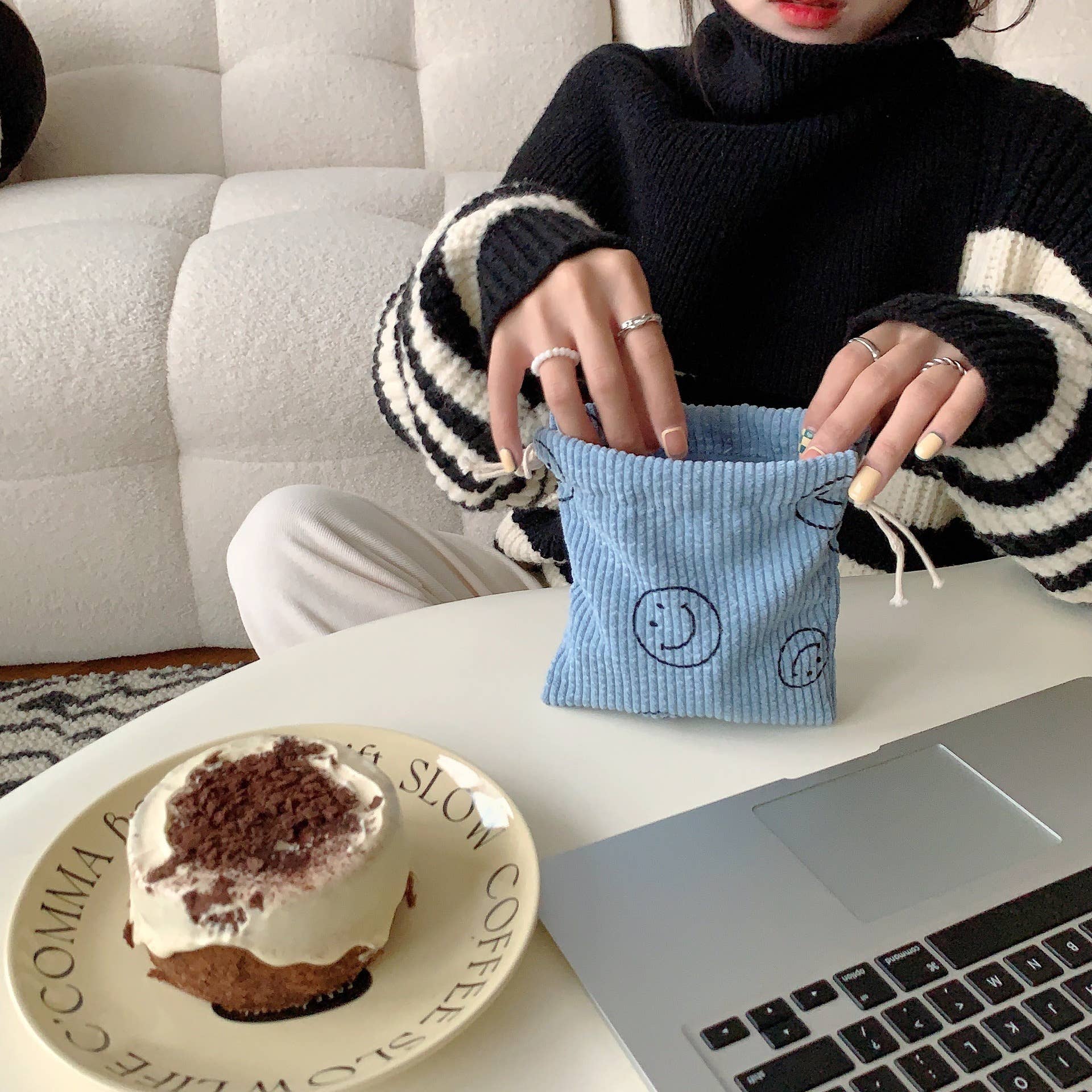 Corduroy Smiley Face Coin Purse Drawstring Pocket Women: Pink