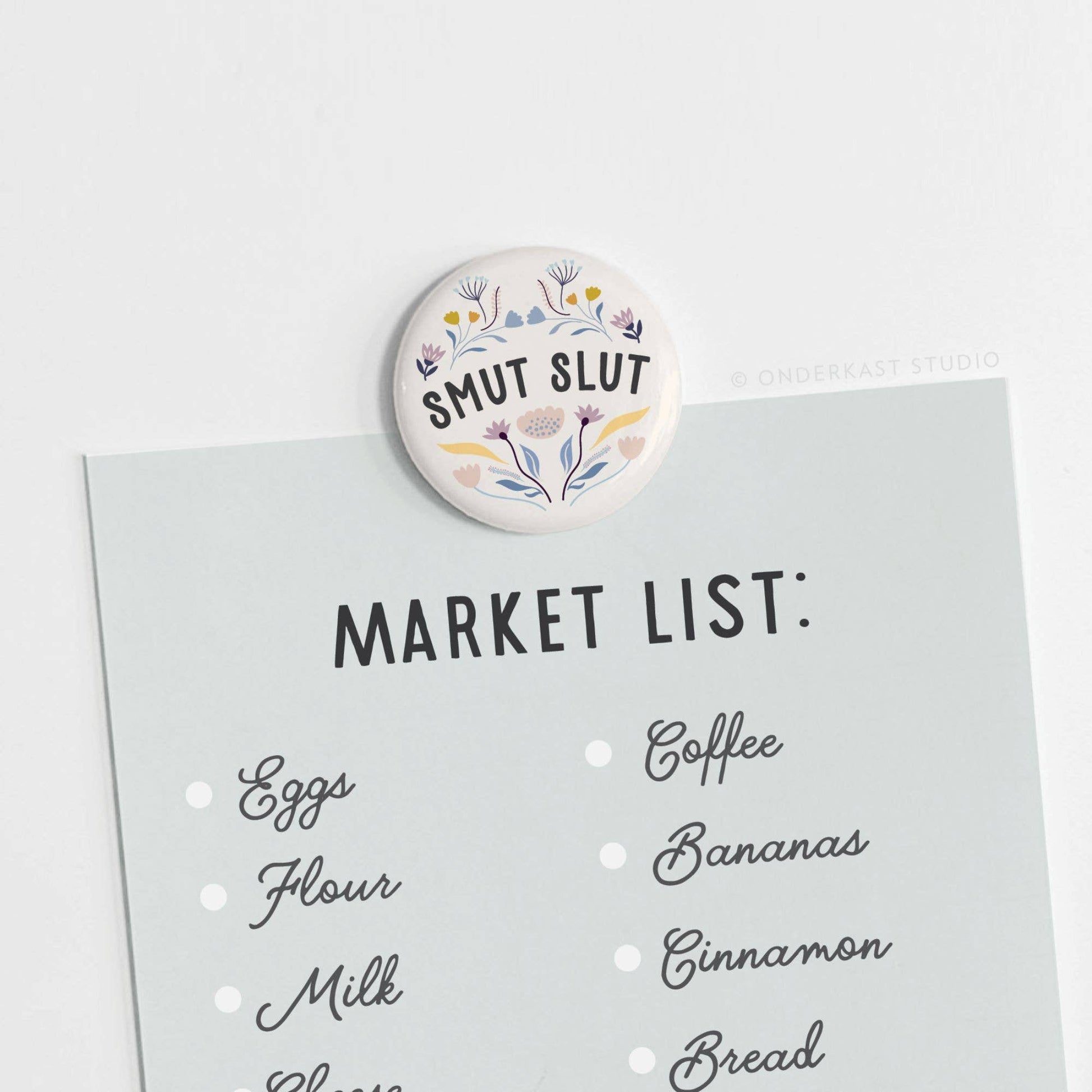 Material: Metal shell with magnet in the back. Front of the magnet is covered with clear protective mylar.