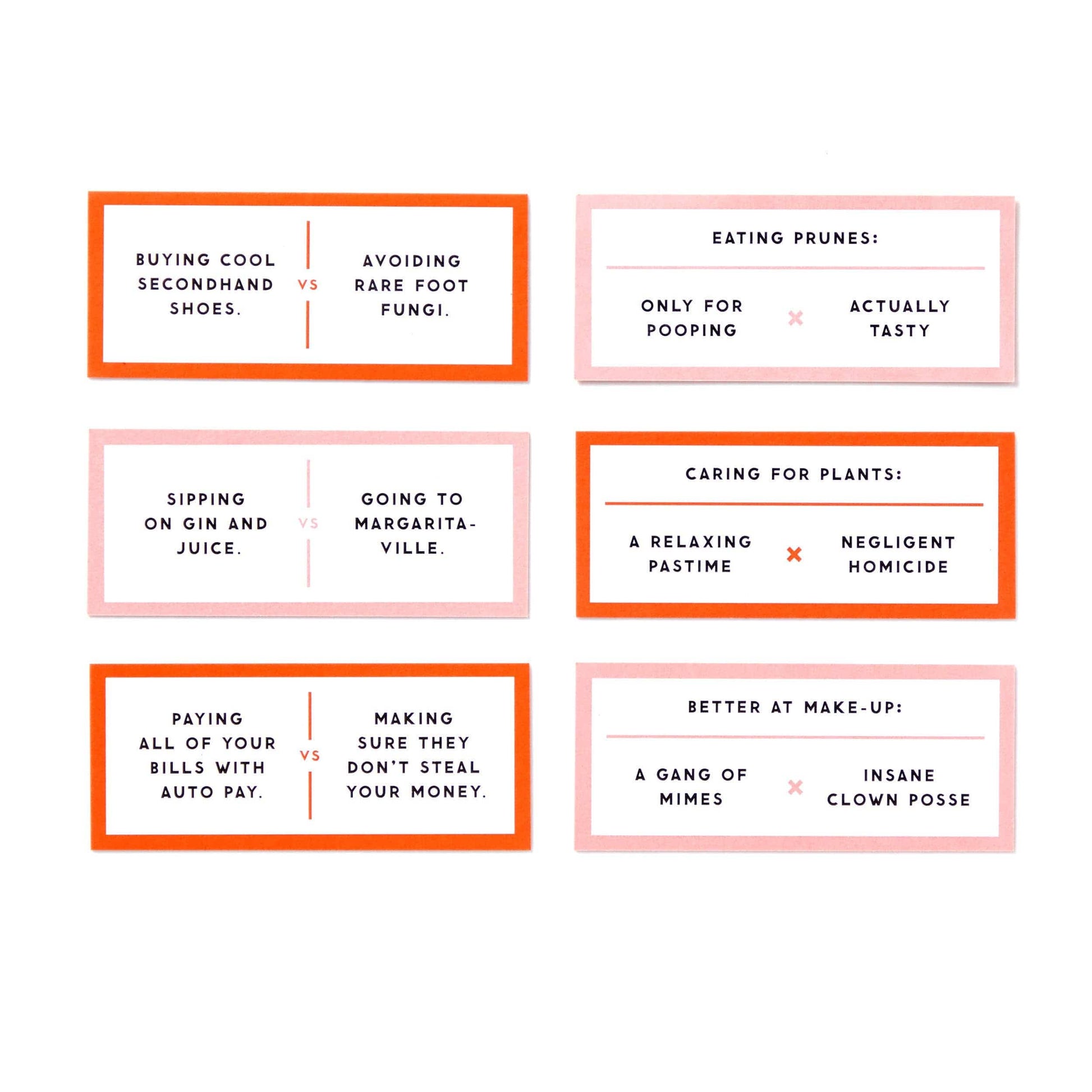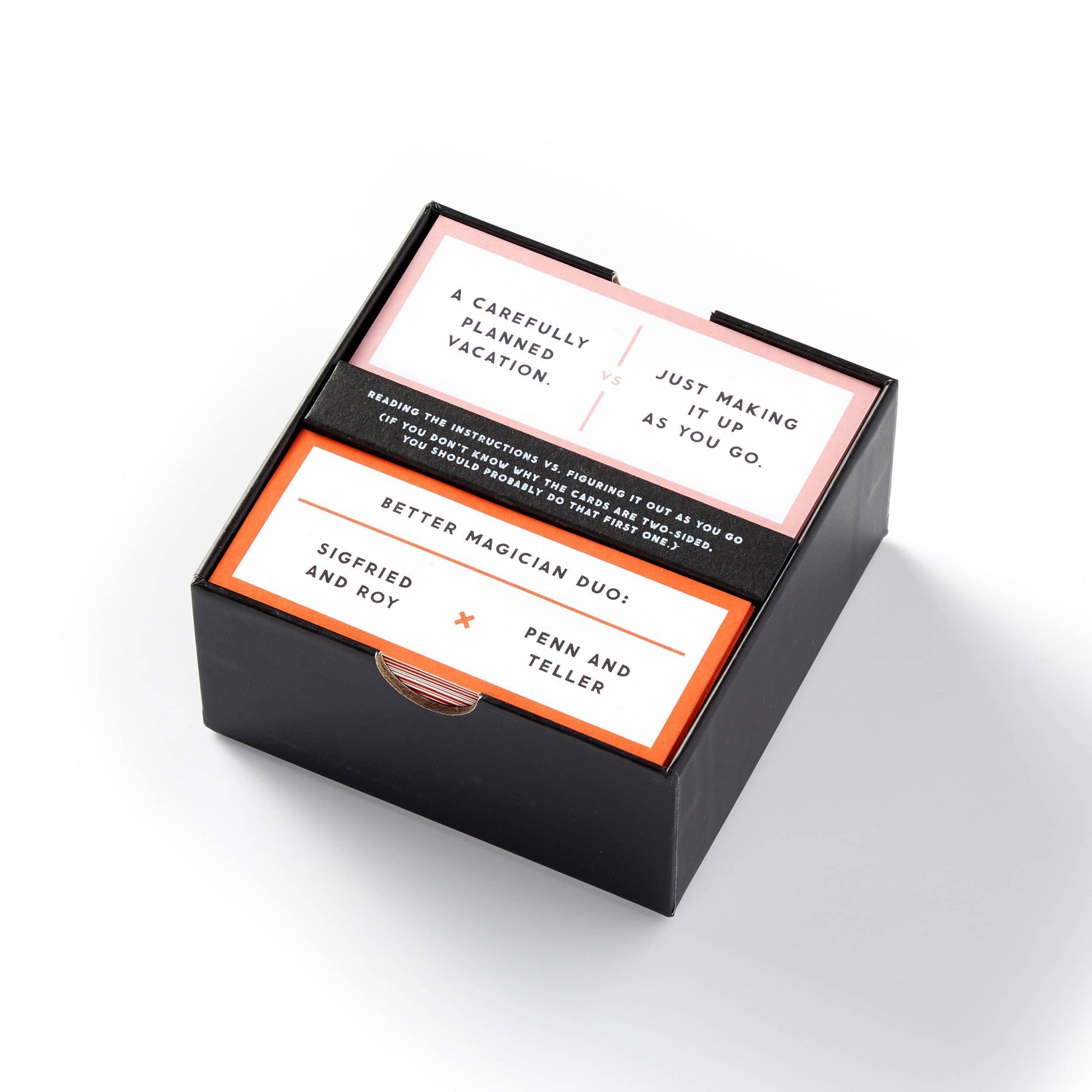 Win points for winning arguments. This social game by Brass Monkey includes 200 game cards, each featuring opposing views of hot button issues...like how to load the dishwasher like an actual human being. Just pick a side, and debate it out. There's no politics, religion, or any of that crap here. There are way more important things to fight about. For example: Those brownie edge pieces are garbage. Go ahead, prove us wrong.