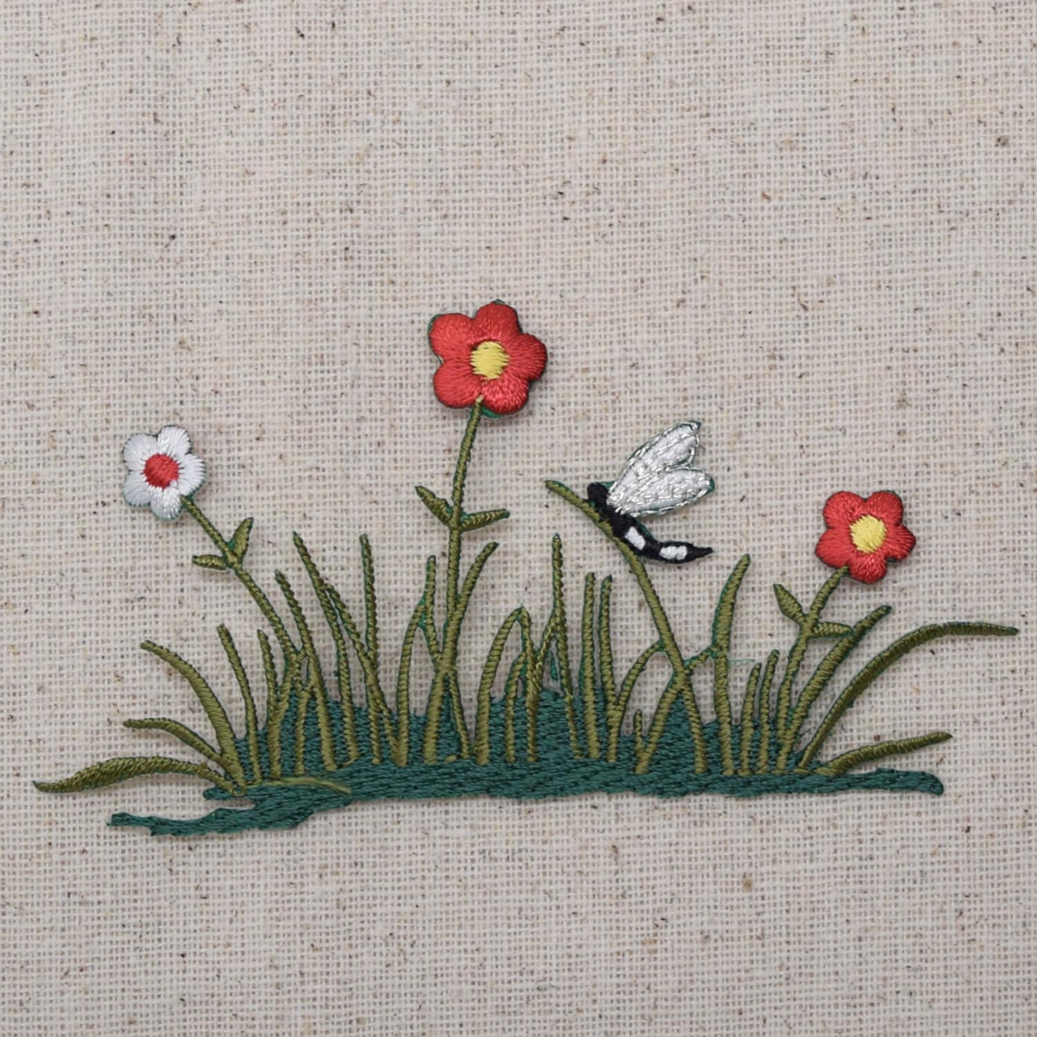 Grass - Red and White Flowers - Patch of Daisies - Dragonfly - Iron on Applique - Embroidered Patch - 695562A