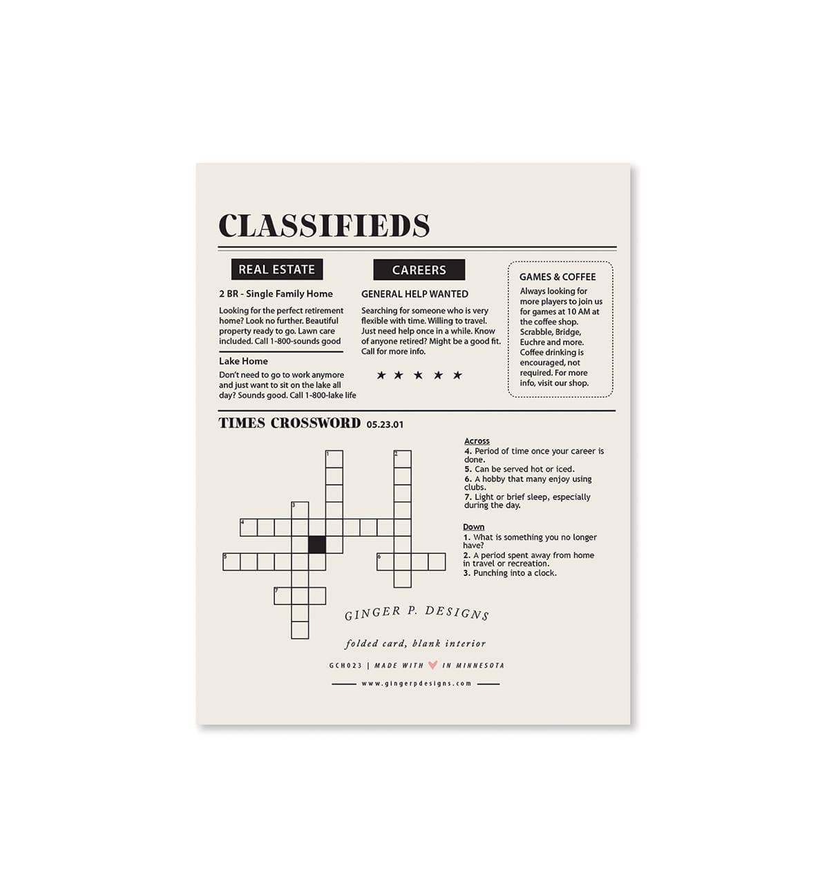 Get a copy of the "Retirement Times" Greeting card for your next retirement party. Full - color 4.25" x 5.5" folded greeting card. Blank interior. Antique gold shimmer envelope included. Our greeting cards come individually packaged in an enclosed plastic sleeve.