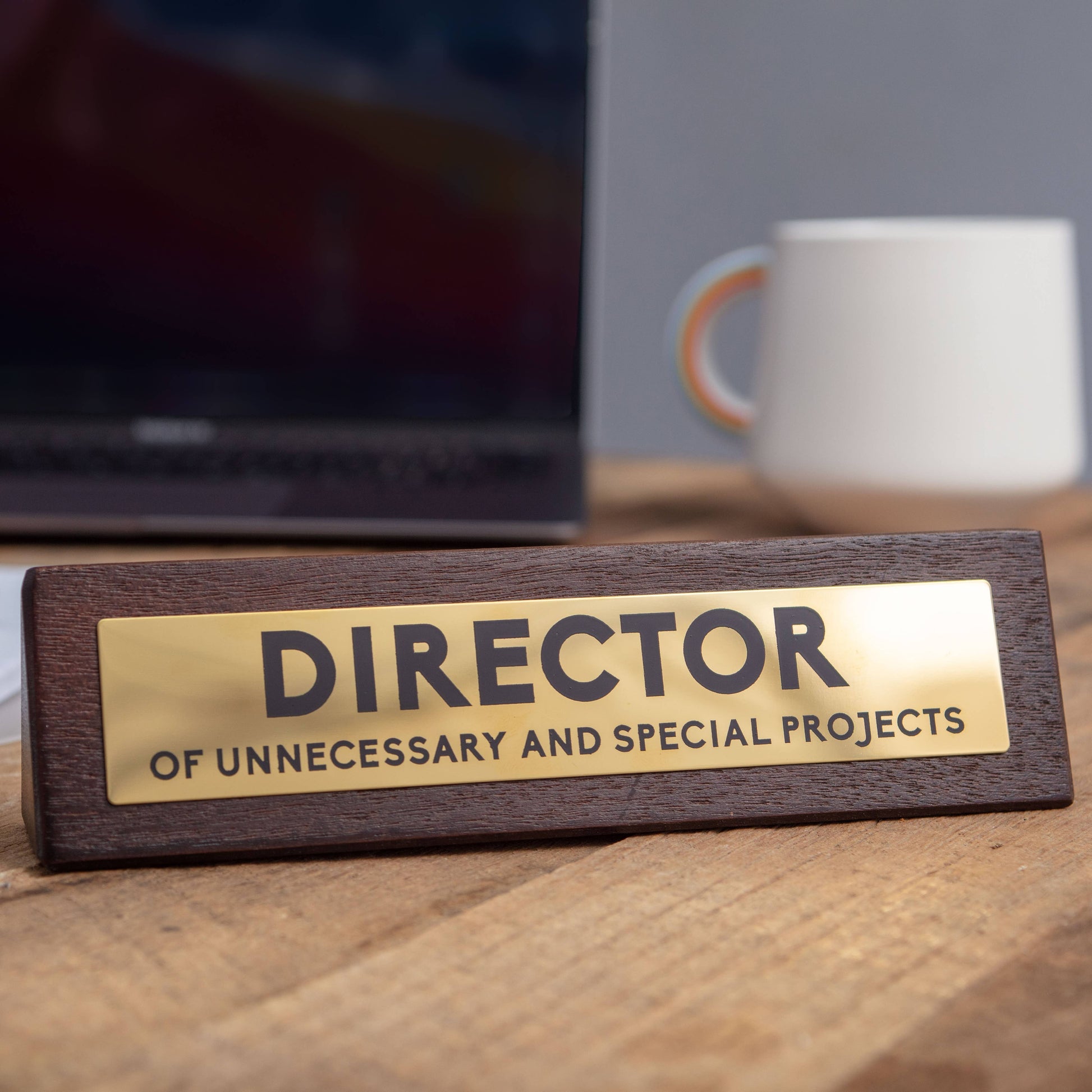 Direct the office with this hilarious yet stylish wooden desk sign, complete with a gold plaque. Tell everyone exactly what to do, even if your projects are very special and completely unnecessary. Perfect as a self indulgent gift to yourself or the "Director" of the workplace.
