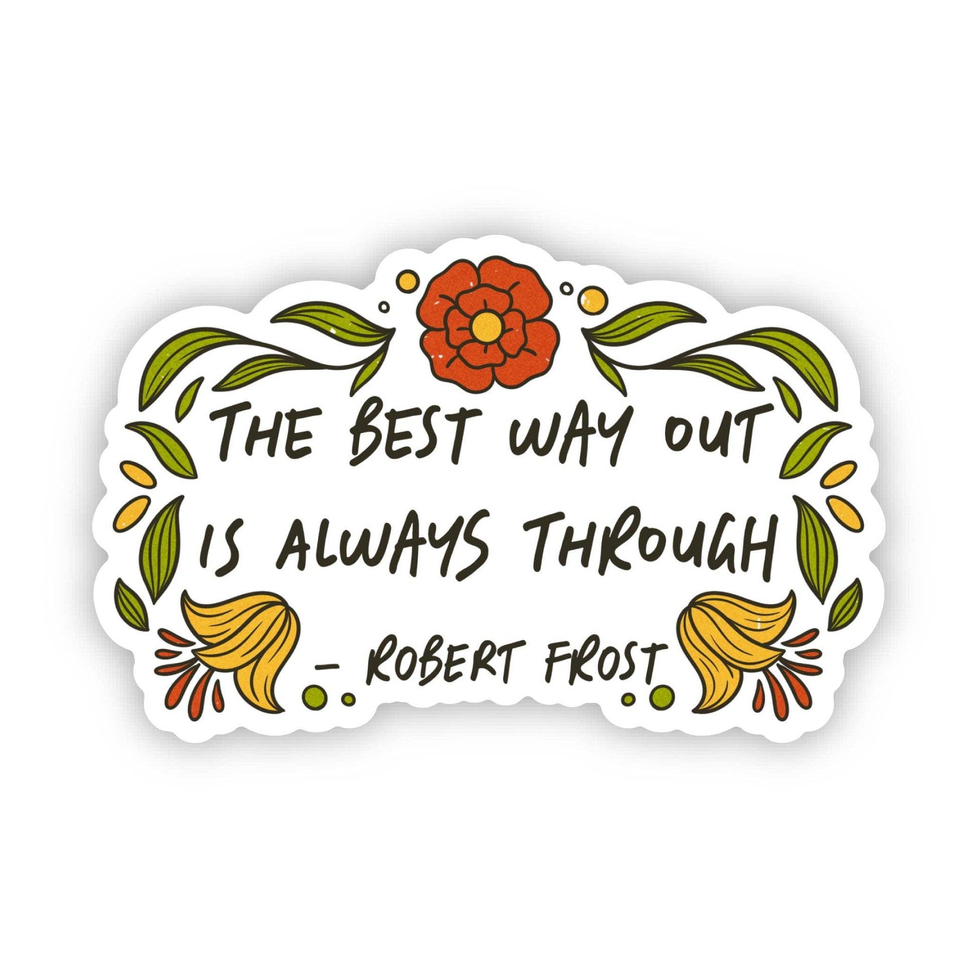 Here's your daily reminder from Robert Frost: "the best way out is always through". This inspiring sticker is perfect for staying motivated through the hard times. High quality vinyl sticker. Great to decorate laptops, water bottles, car windows, coolers, suitcases, bikes, kayaks, phone cases, journals, and more.