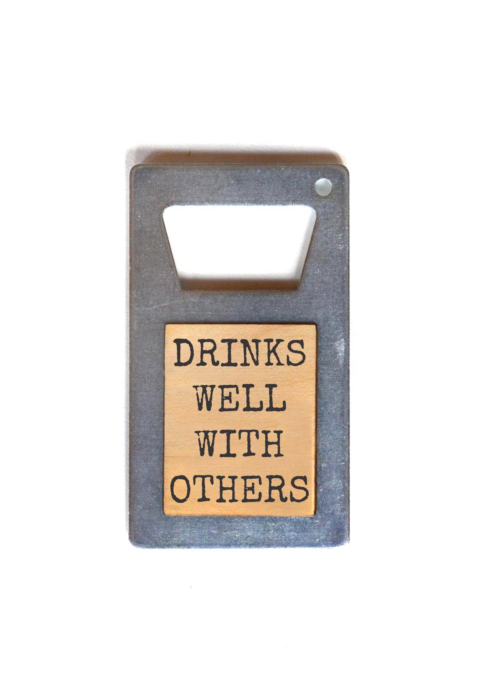 Drinks Well With Others Beer Bottle Opener. Each bottle has a magnet attached so it can easily be placed on a refrigerator. Heavy duty metal that will never bend.
