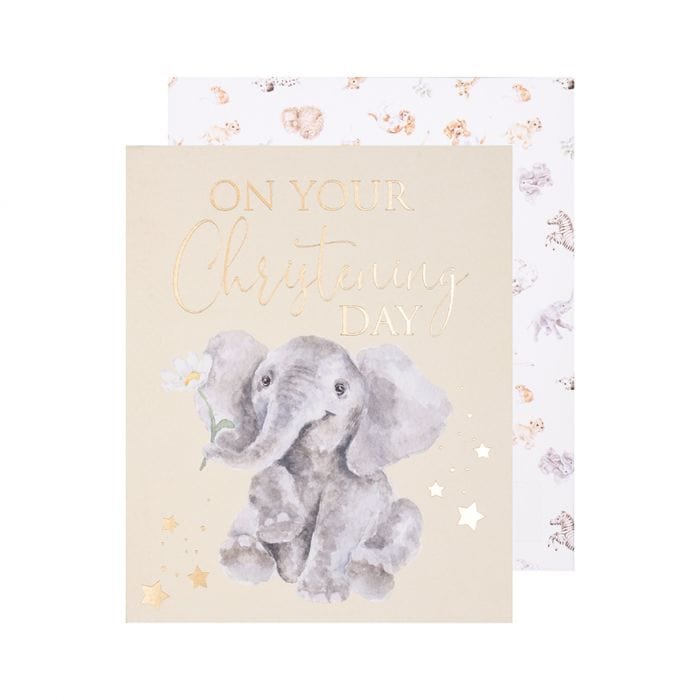 Celebrate a christening with this gorgeous elephant card. Printed on high quality, sustainably sourced textured board from responsibly managed forests. Inside reads 'On your special day'. Supplied with a printed envelope and measures 7 x 5 inches.