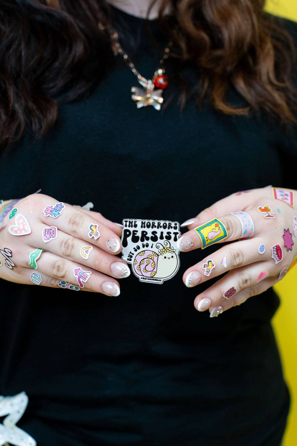 Keep calm and crawl on with the The Horrors Persist But So Do I Magnet! Featuring an adorable pastel snail surrounded by floral accents, this magnet is a gentle reminder that strength doesn’t have to be loud to be powerful. Equal parts cute and cathartic, it blends humor, heart, and hope into one glossy acrylic design. Perfect for your fridge, office, or anywhere you need a little dose of quiet resilience.