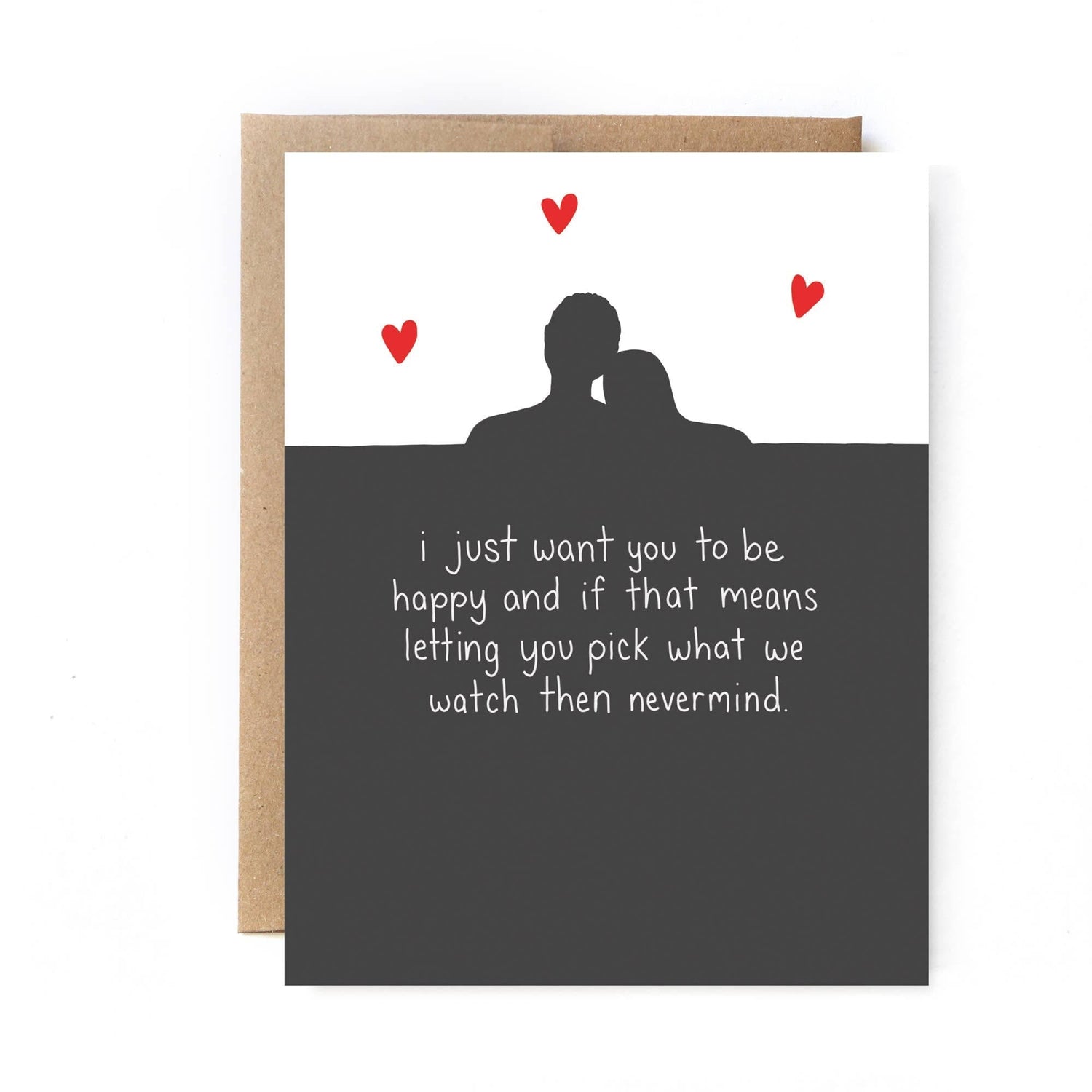 "I just want you to be happy and if that means letting you pick what we watch then nevermind" - 5.5 in. x 4.25 in. (A2) folded card - Includes a 100% recycled kraft envelope - Professionally printed on 130# recycled card stock - Packaged in a clear sleeve (but you can request plastic-free!) - Designed and printed in the U.S. - Blank inside for buyer's own personal message Unblushing in a woman-owned, family-run business based in southern California.